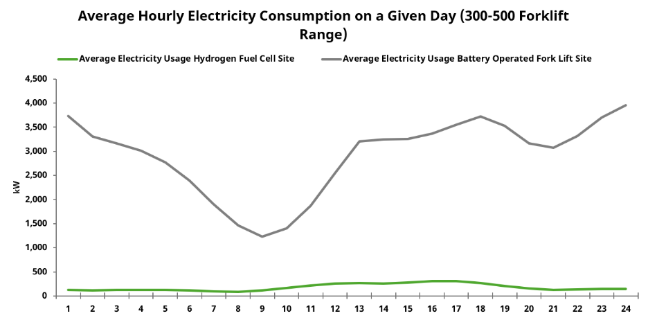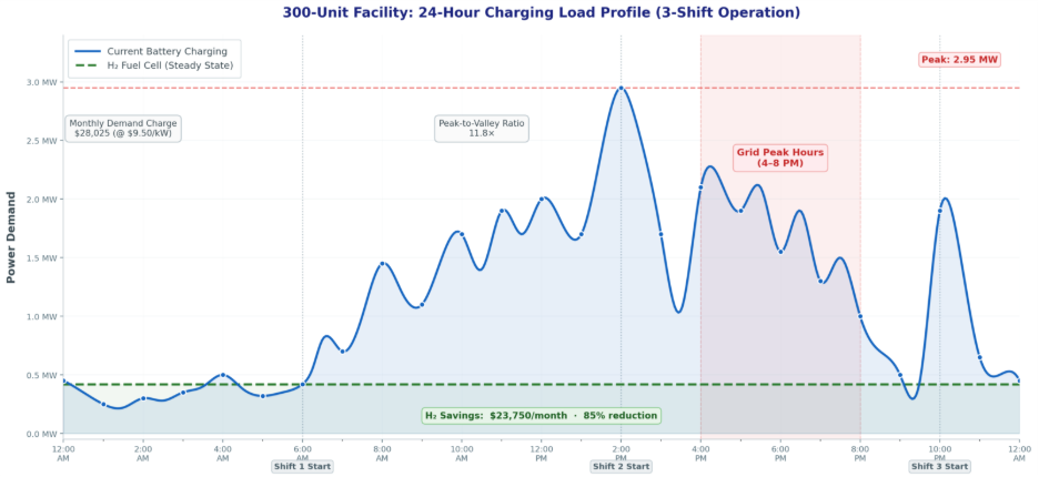 Battery infrastructure consumes 10,000–20,000 square feet for charging rooms, safety zones, and spare battery space that could otherwise store thousands of additional pallets. Hydrogen fuel cells eliminate these requirements, freeing valuable facility space while reducing electrical infrastructure demands and peak demand charges.